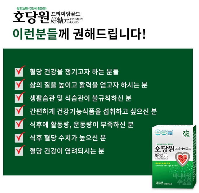 호당원 프리미엄 골드는 혈당 건강이 염려되시는 분, 식후 혈당 수치가 높으신 분, 식후 활동량 운동량이 부족하신 분, 간편한 건강기능식품을 섭취하고 싶으신 분, 식습관이 불규칙하신 분, 삶의 활력을 찾으시려는 분, 혈당 건강을 챙기시는 분이 필요하다고 합니다.